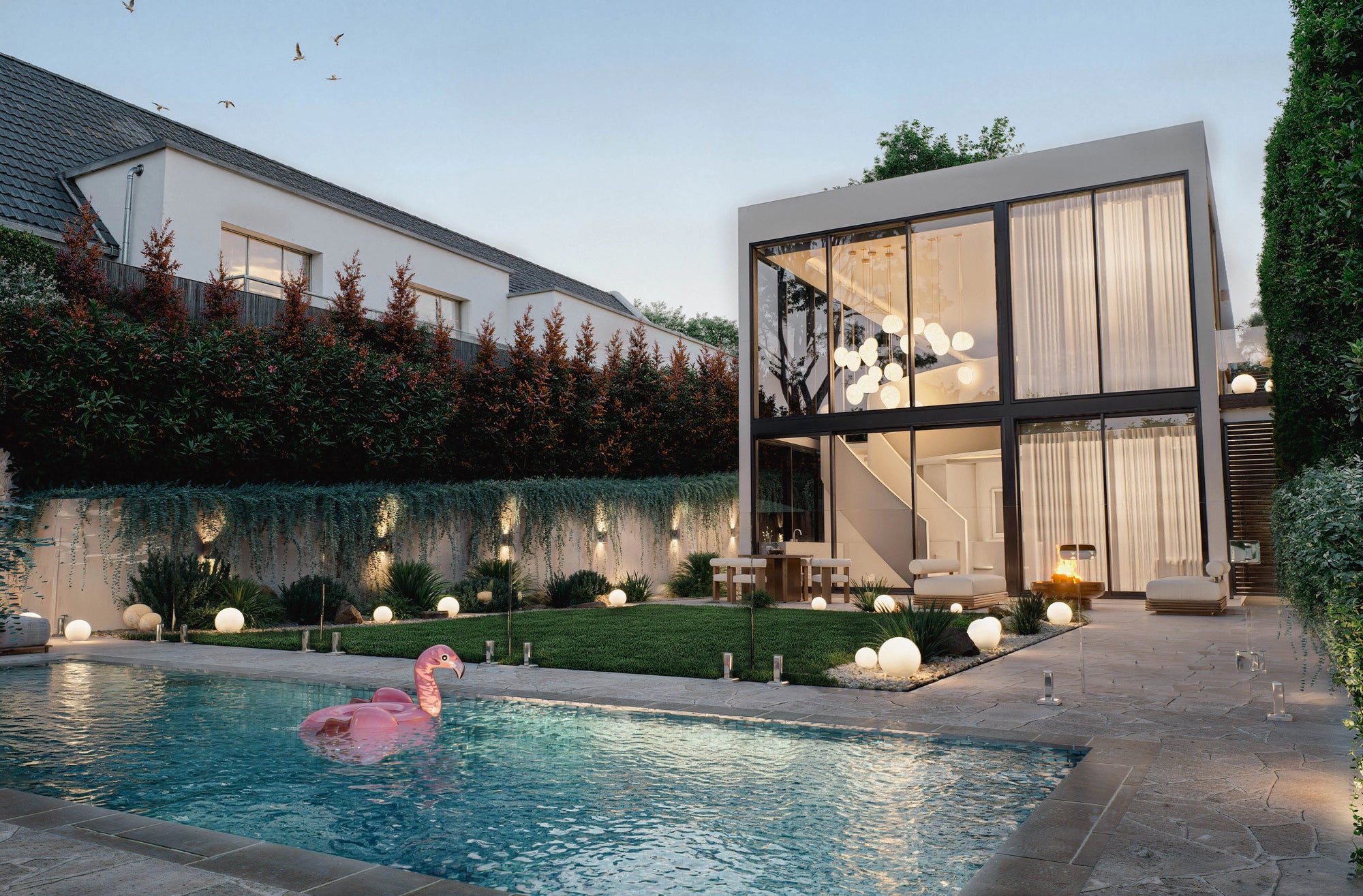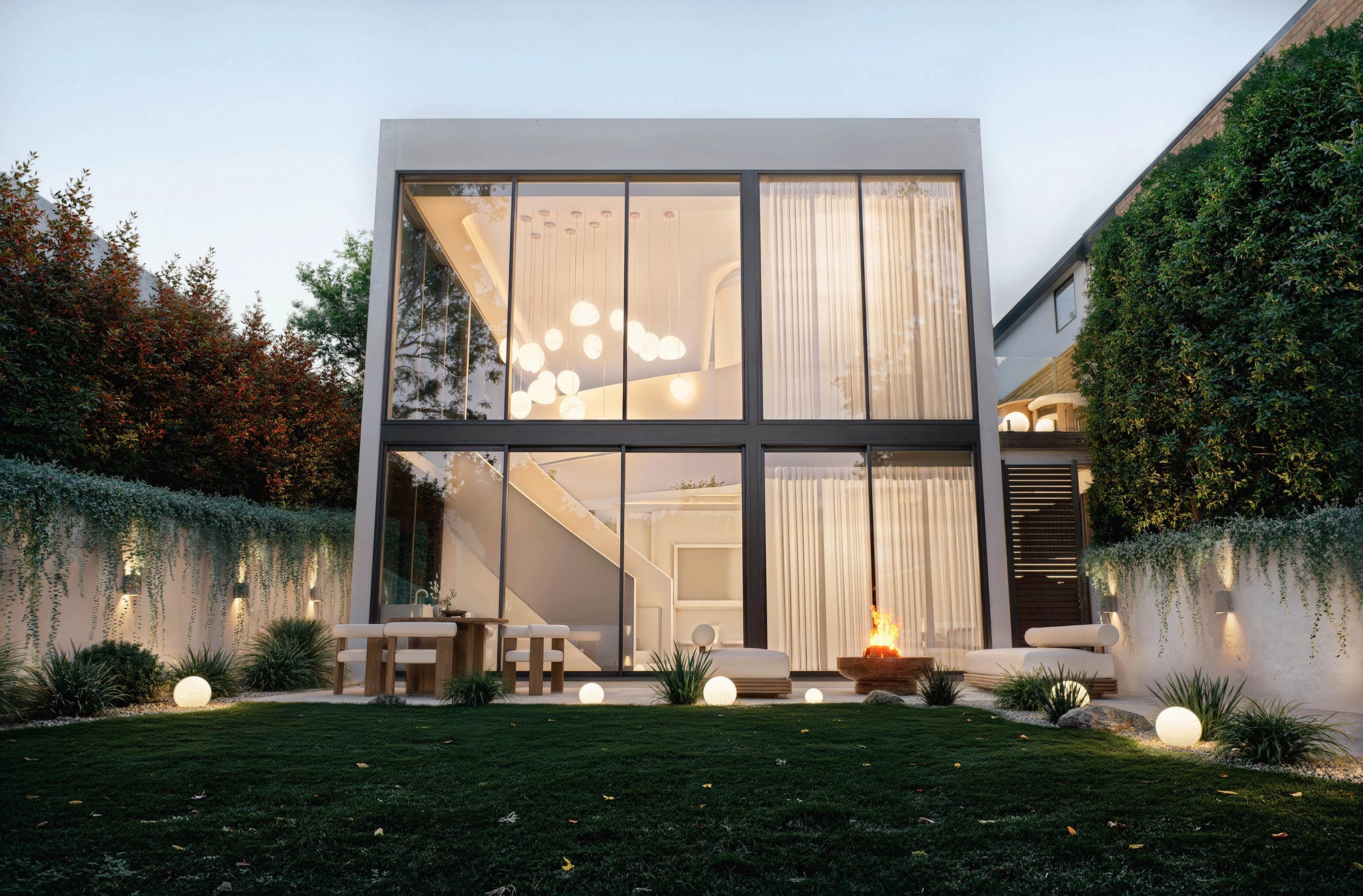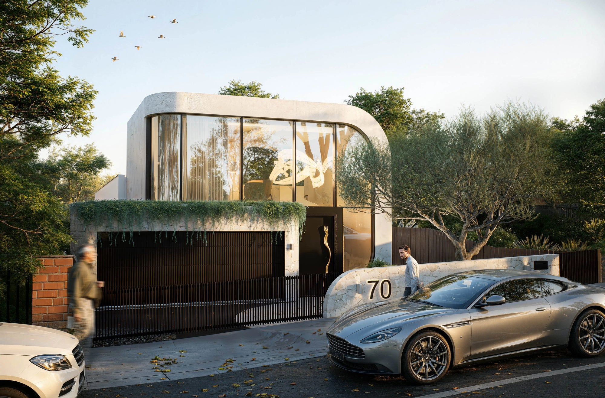 The aggressive tension between the fluid concrete ribbon at the front facade and the colossal double-height glass grid at the rear creates a dynamic architectural volume that dismantles the traditional boundary between interior and exterior — where cascading vines crash against the built form and outdoor crazy paving bleeds directly into the refined internal finishes.