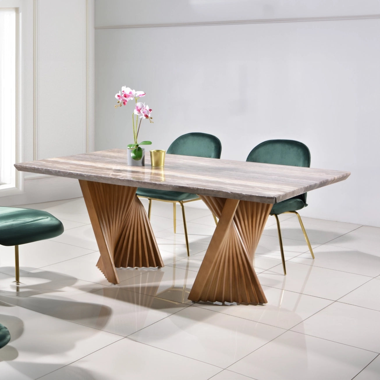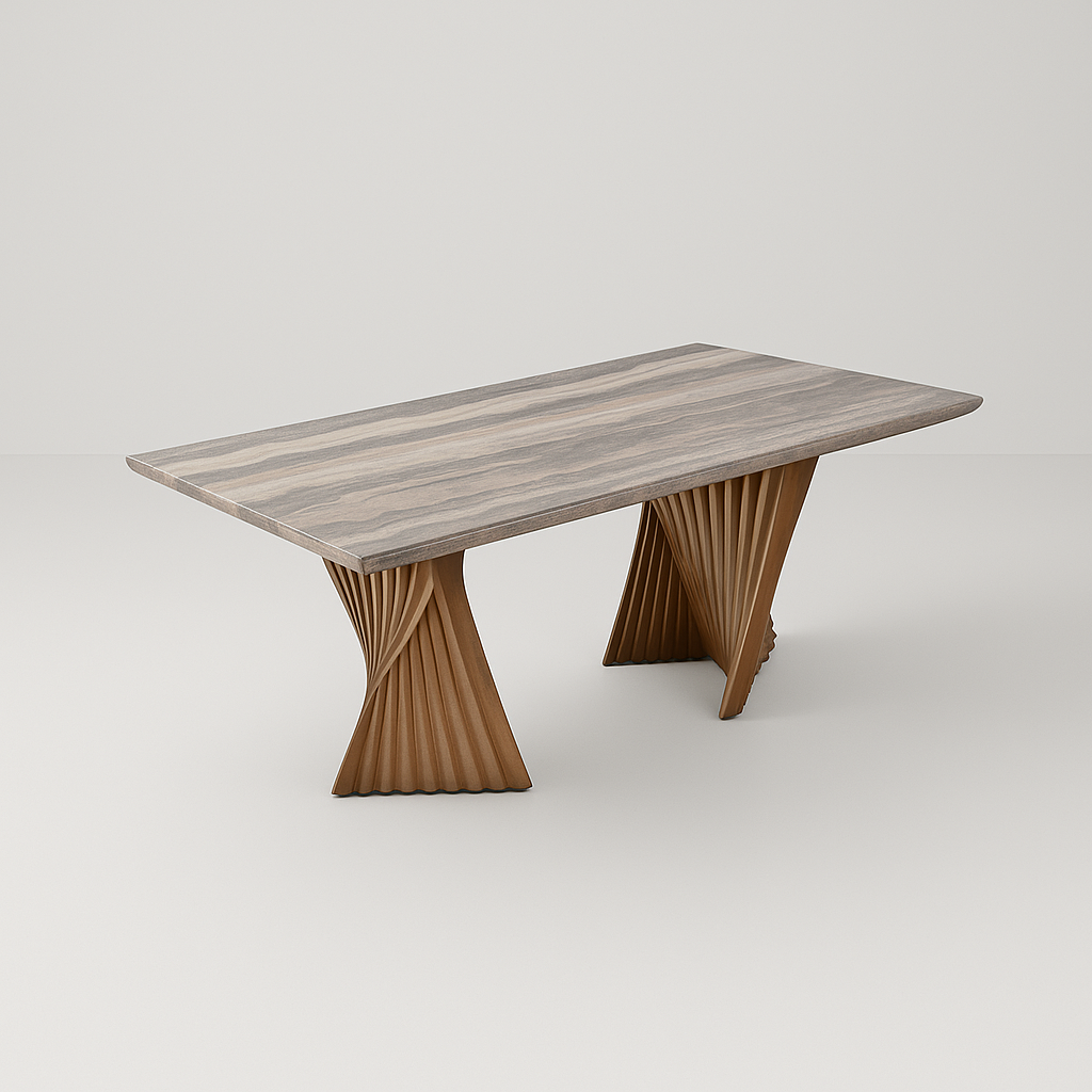 The Solaro Twin-Pillar Dining Table showcases a bold design with a striking striped stone top and sculpted twin pedestal bases. Crafted for modern interiors, its elegant lines and natural textures bring warmth and sophistication to any dining space. A perfect blend of function and style for both casual and formal settings.