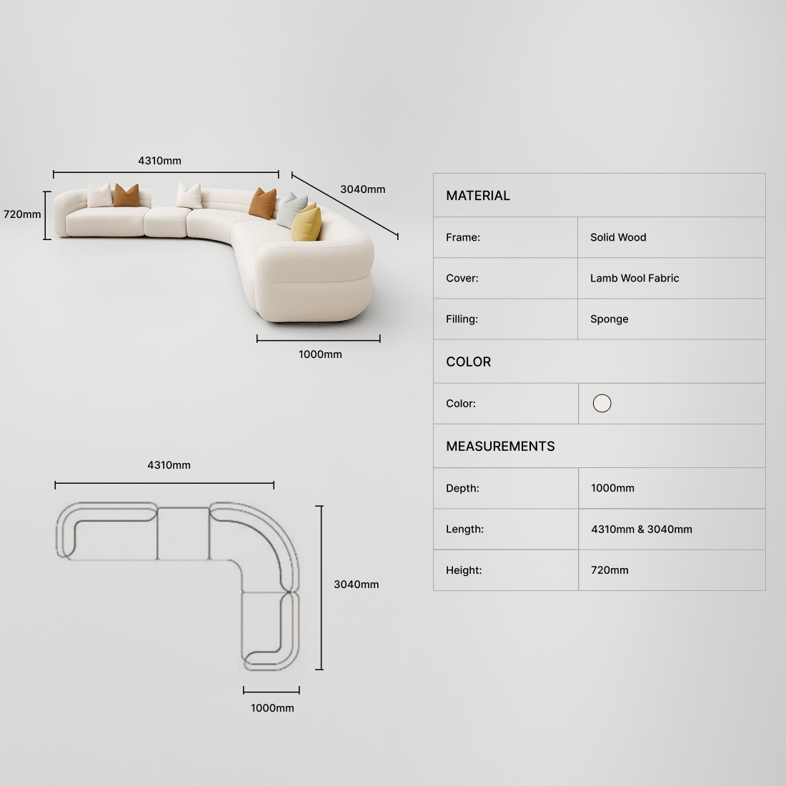 | Dimensions(mm): | L4310-3040mm x D1000 x H720mm |