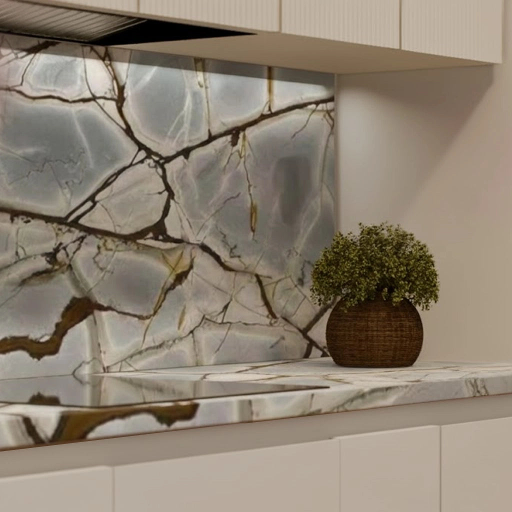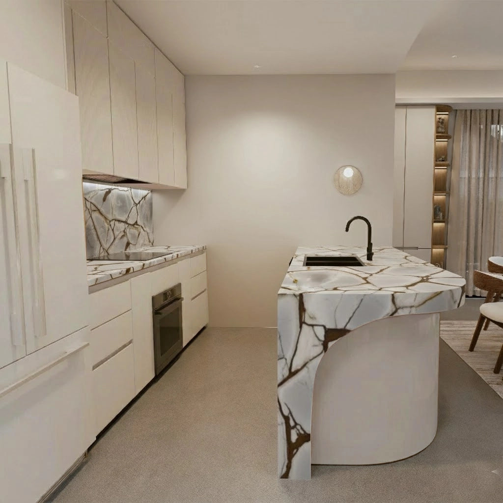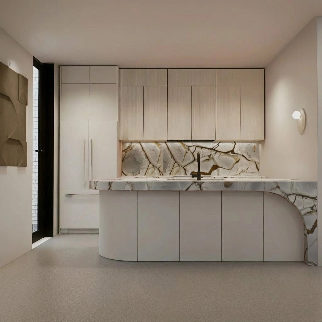 Crafted from premium countertop and splashback stones, these custom kitchen benchtops and matching splashbacks feature a refined, smooth surface with subtle natural veining that elevates any modern culinary space. Their clean, minimalist design provides versatile performance—perfect for meal preparation, kitchen islands, breakfast bars, or as a striking focal point in contemporary interiors.