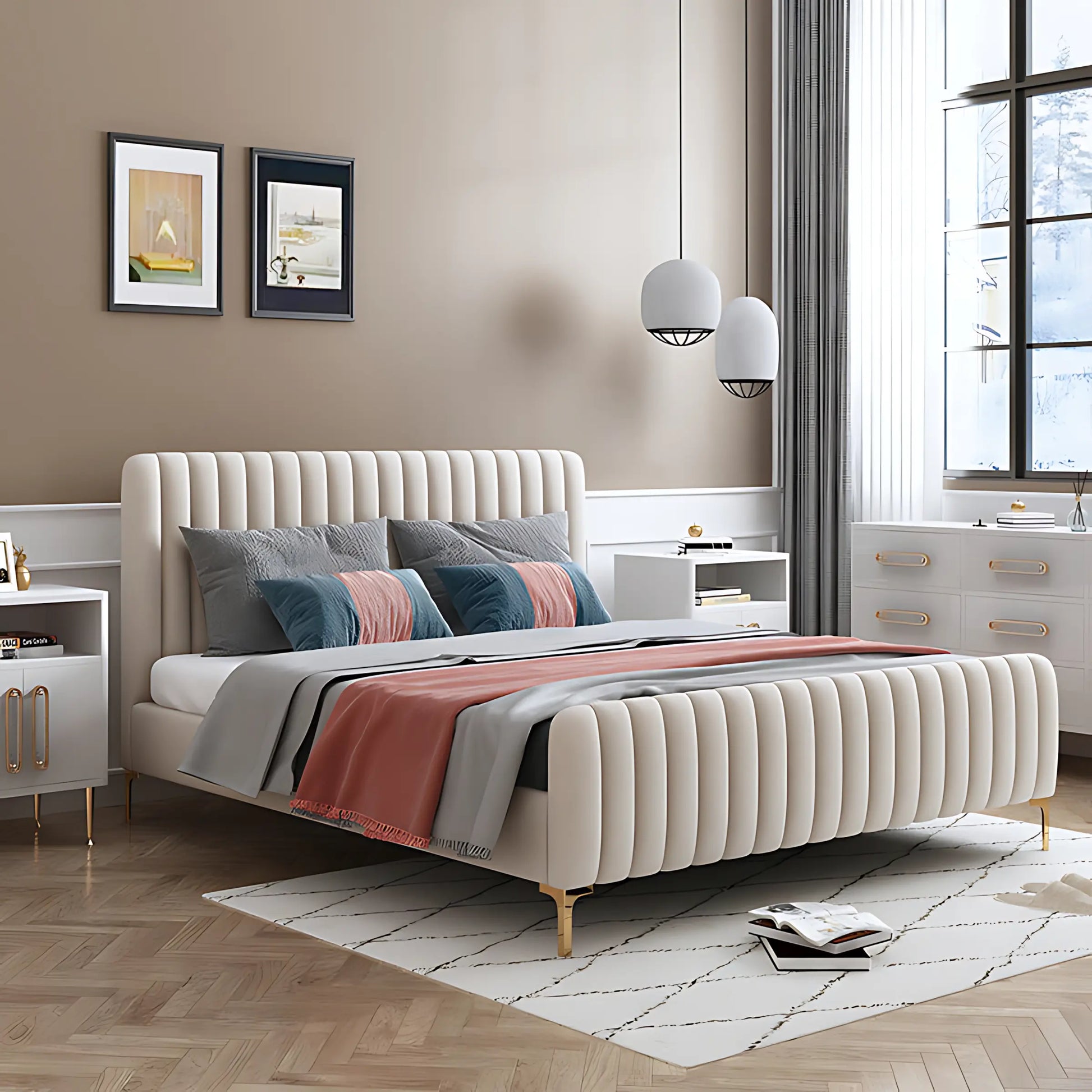 Crafted from premium materials, our Bed Frame guarantees comfort and durability. The high-quality fabric adds a touch of elegance to any bedroom, making it the perfect choice for a restful night's sleep. Experience luxury and style with every use.