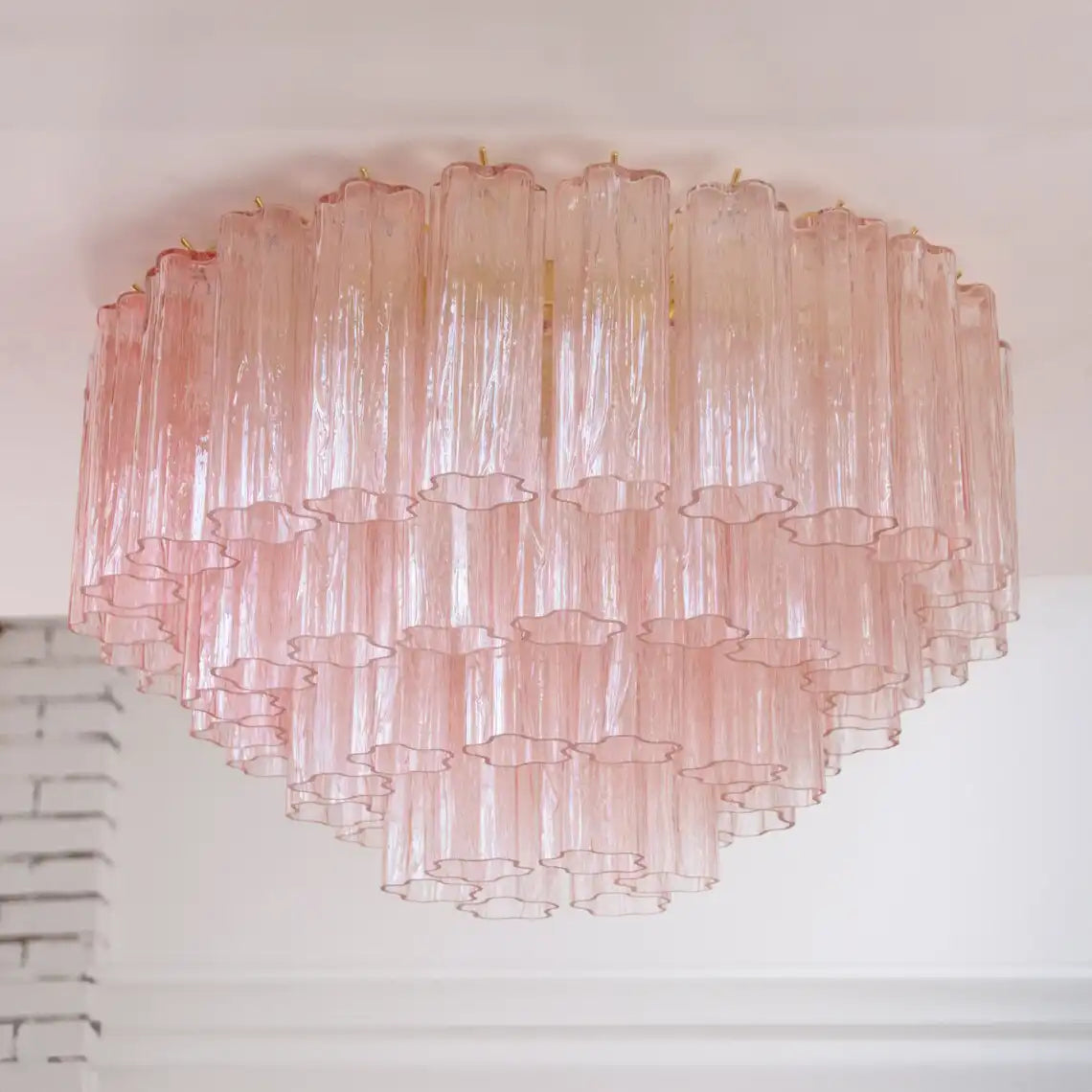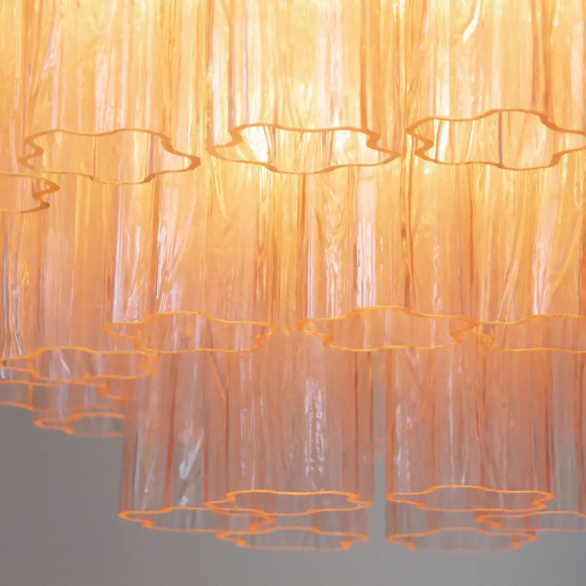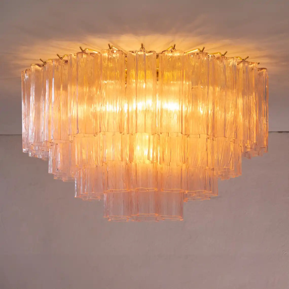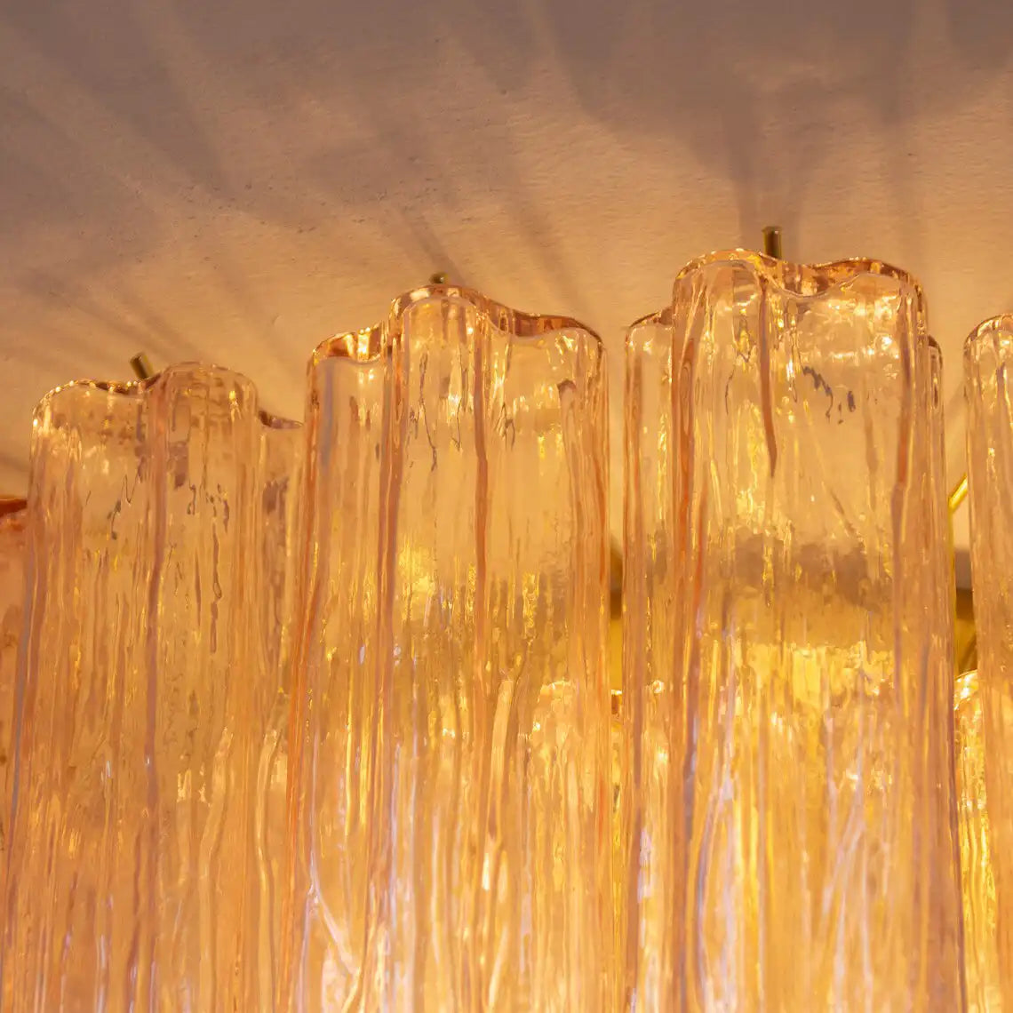 Large ceiling light with cipria Murano glass Tronchi, ceiling chandelier diameter 65 cm design vintage style Made in Italy. Warm interior lights gently illuminate through the glass, producing a golden glow that dances across the rippled surfaces, creating both ambient and decorative lighting.