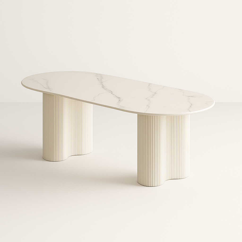 The Marena Flute Dining Table features a smooth marble top and elegantly fluted pedestal legs with soft wave detailing. Its all-white finish and sculptural form offer a serene, modern aesthetic—perfect for refined interiors that embrace simplicity with sophistication.