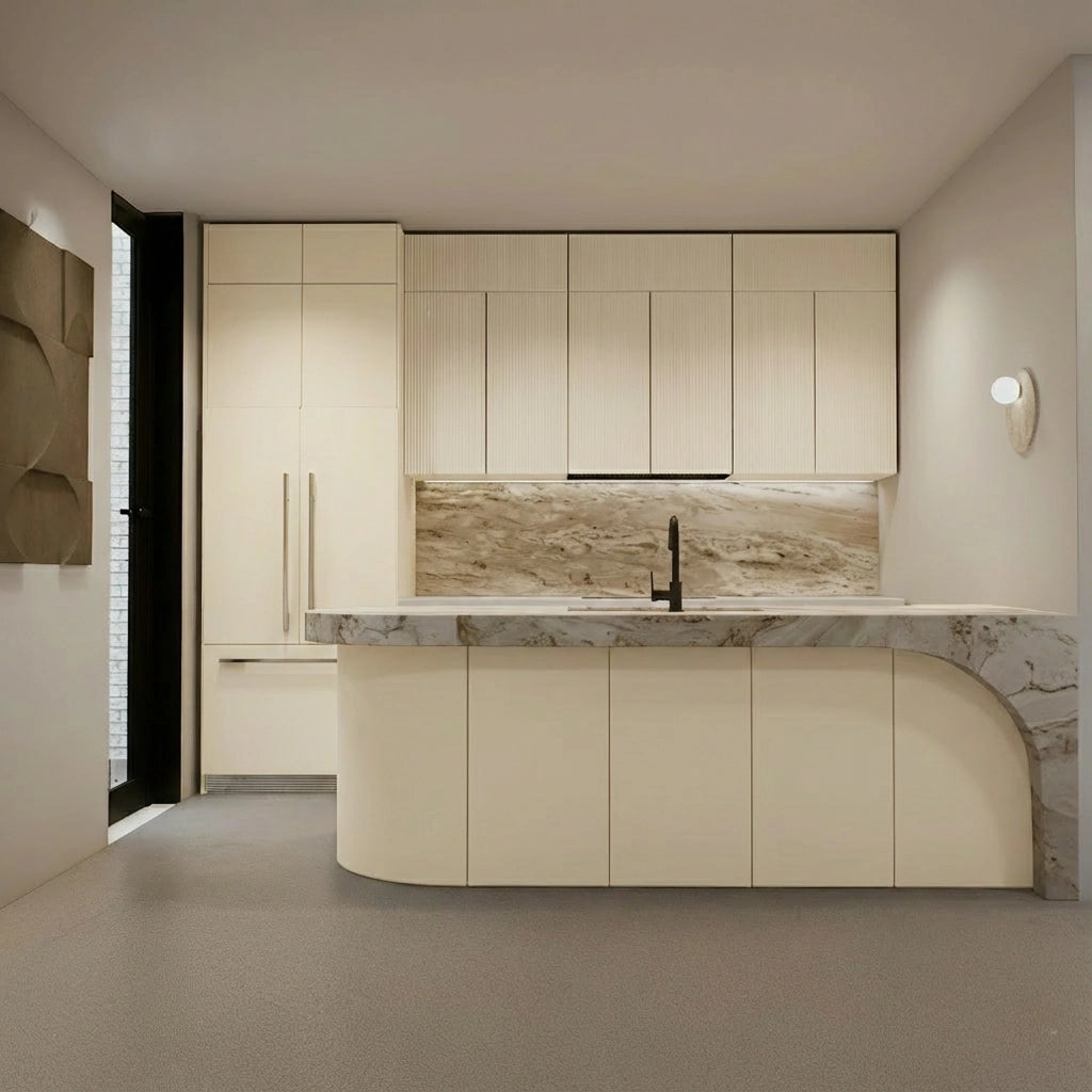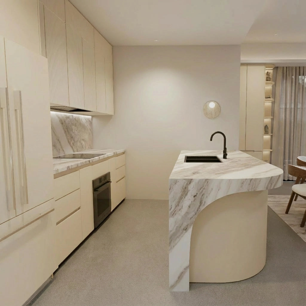 Crafted from premium countertop and splashback stones, these custom kitchen benchtops and matching splashbacks feature a refined, smooth surface with subtle natural veining that elevates any modern culinary space. Their clean, minimalist design provides versatile performance—perfect for meal preparation, kitchen islands, breakfast bars, or as a striking focal point in contemporary interiors.
