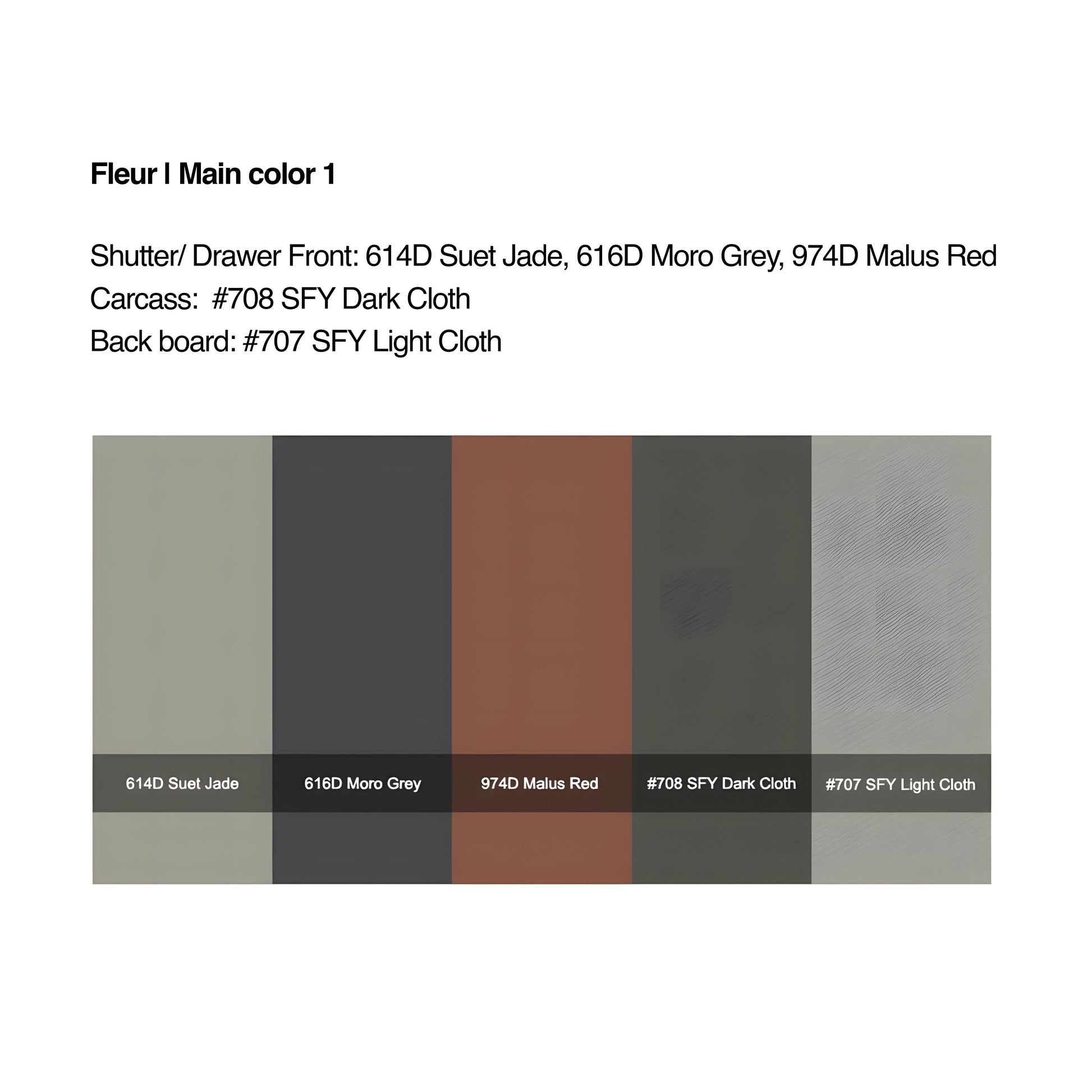 Shutter/ Drawer Front: 614D Suet Jade, 616D | Moro Grey, 974D Malus Red