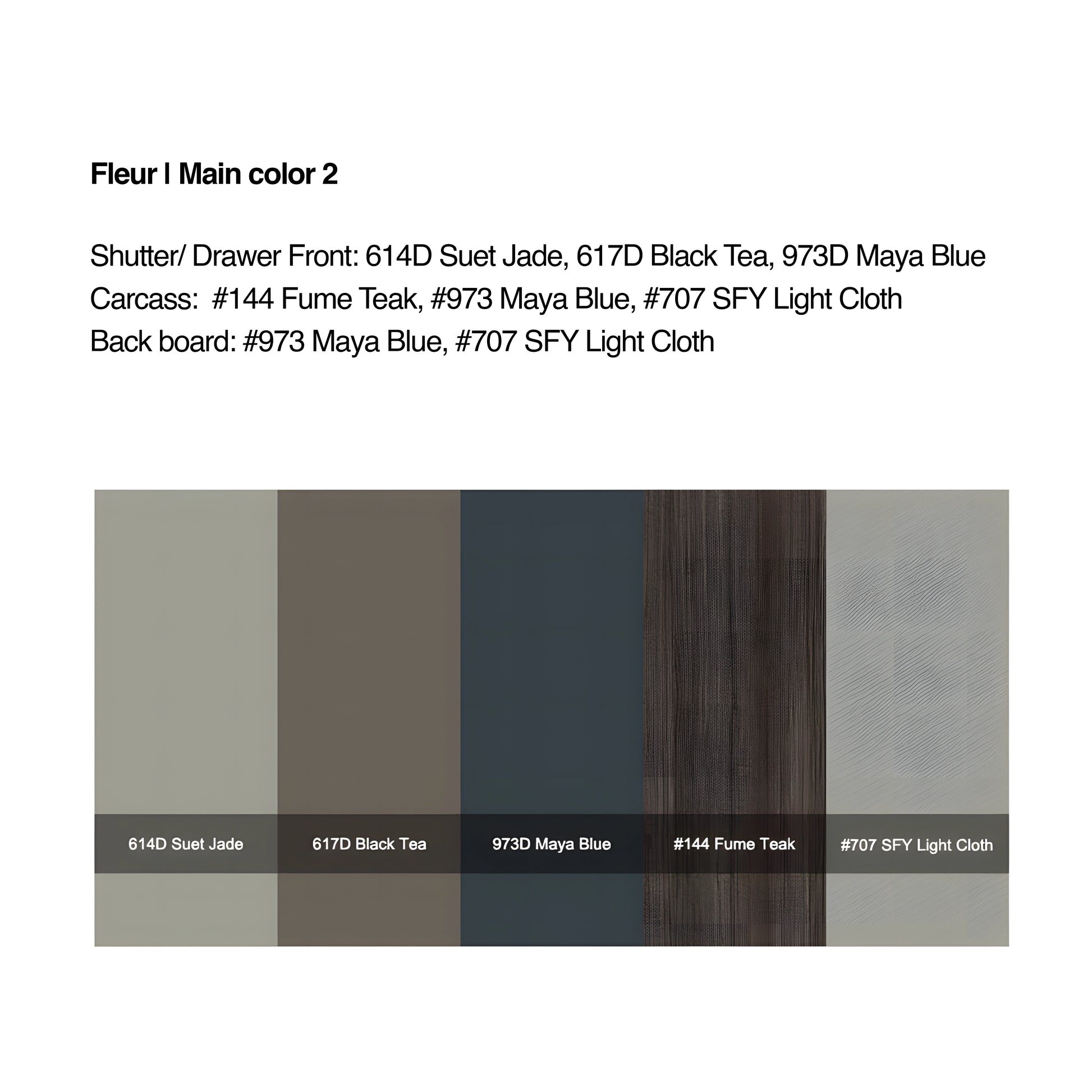 Shutter/ Drawer Front: 614D Suet Jade, 617D Black Tea, 973D Maya Blue