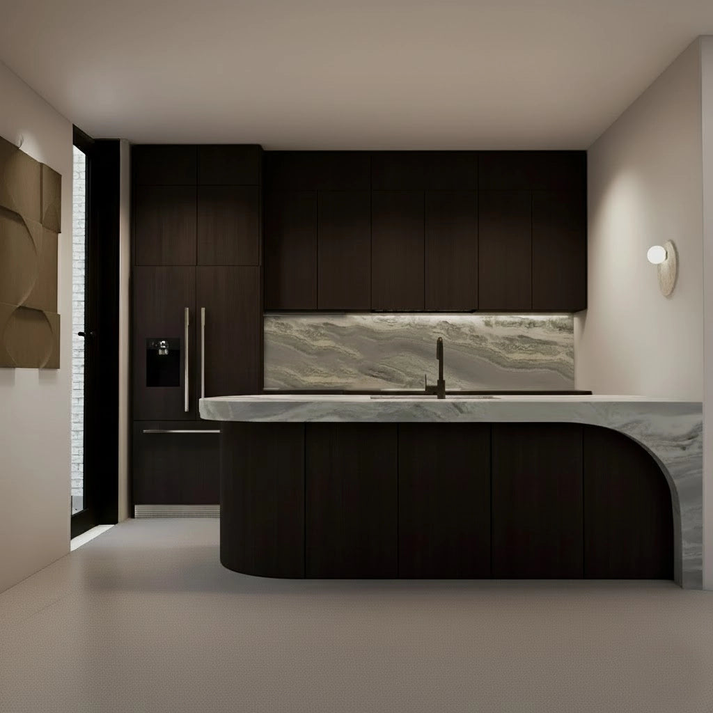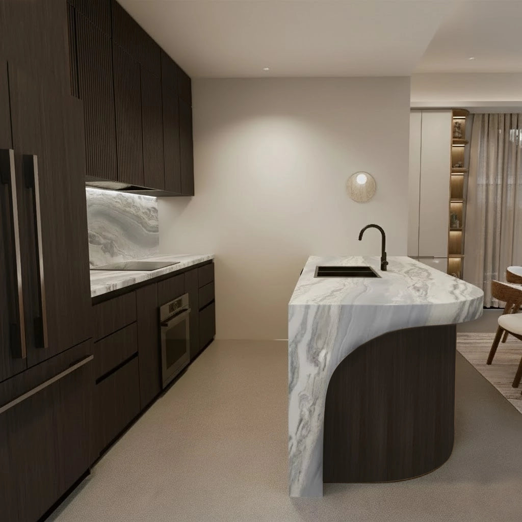 Crafted from premium countertop and splashback stones, these custom kitchen benchtops and matching splashbacks feature a refined, smooth surface with subtle natural veining that elevates any modern culinary space. Their clean, minimalist design provides versatile performance—perfect for meal preparation, kitchen islands, breakfast bars, or as a striking focal point in contemporary interiors.