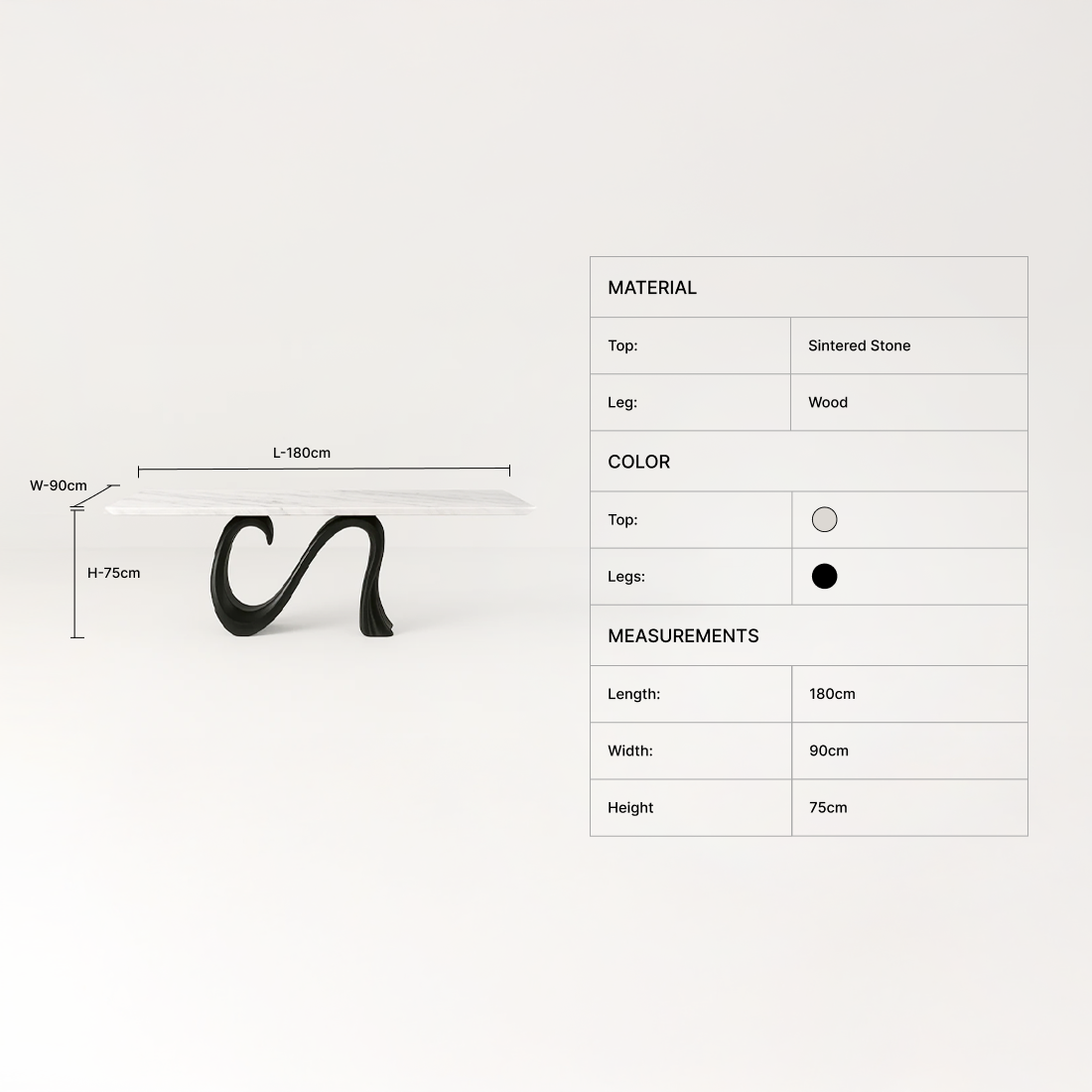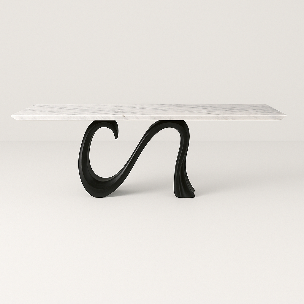 The Noire Flow Dining Table captivates with its artistic, wave-inspired black base and refined white marble top. Its sculptural form creates a sense of movement, offering a bold yet graceful presence in any dining space. Ideal for those who appreciate modern elegance with a creative edge.