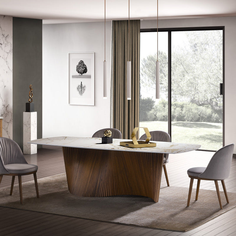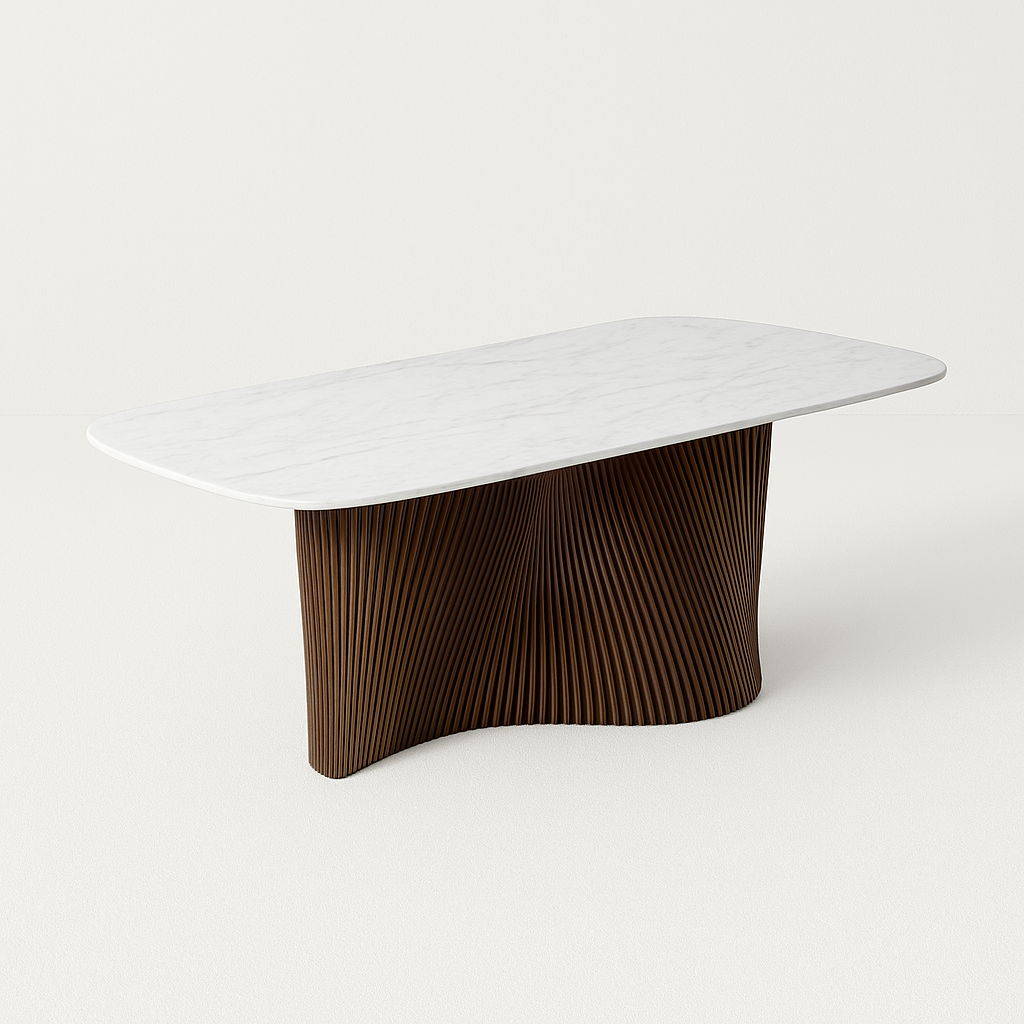 The Virello Curve Dining Table features a sleek marble top paired with a sculpted wood base that flows with natural elegance. Its curved lines and fine textures make it a modern centerpiece for any dining room. Designed for both comfort and style, it’s ideal for everyday meals and elegant entertaining.