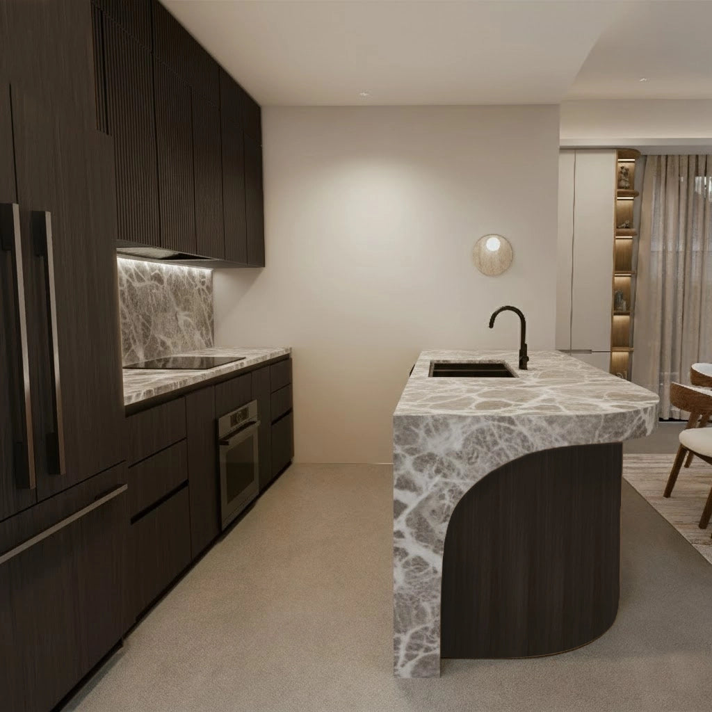 Crafted from premium countertop and splashback stones, these custom kitchen benchtops and matching splashbacks feature a refined, smooth surface with subtle natural veining that elevates any modern culinary space. Their clean, minimalist design provides versatile performance—perfect for meal preparation, kitchen islands, breakfast bars, or as a striking focal point in contemporary interiors.
