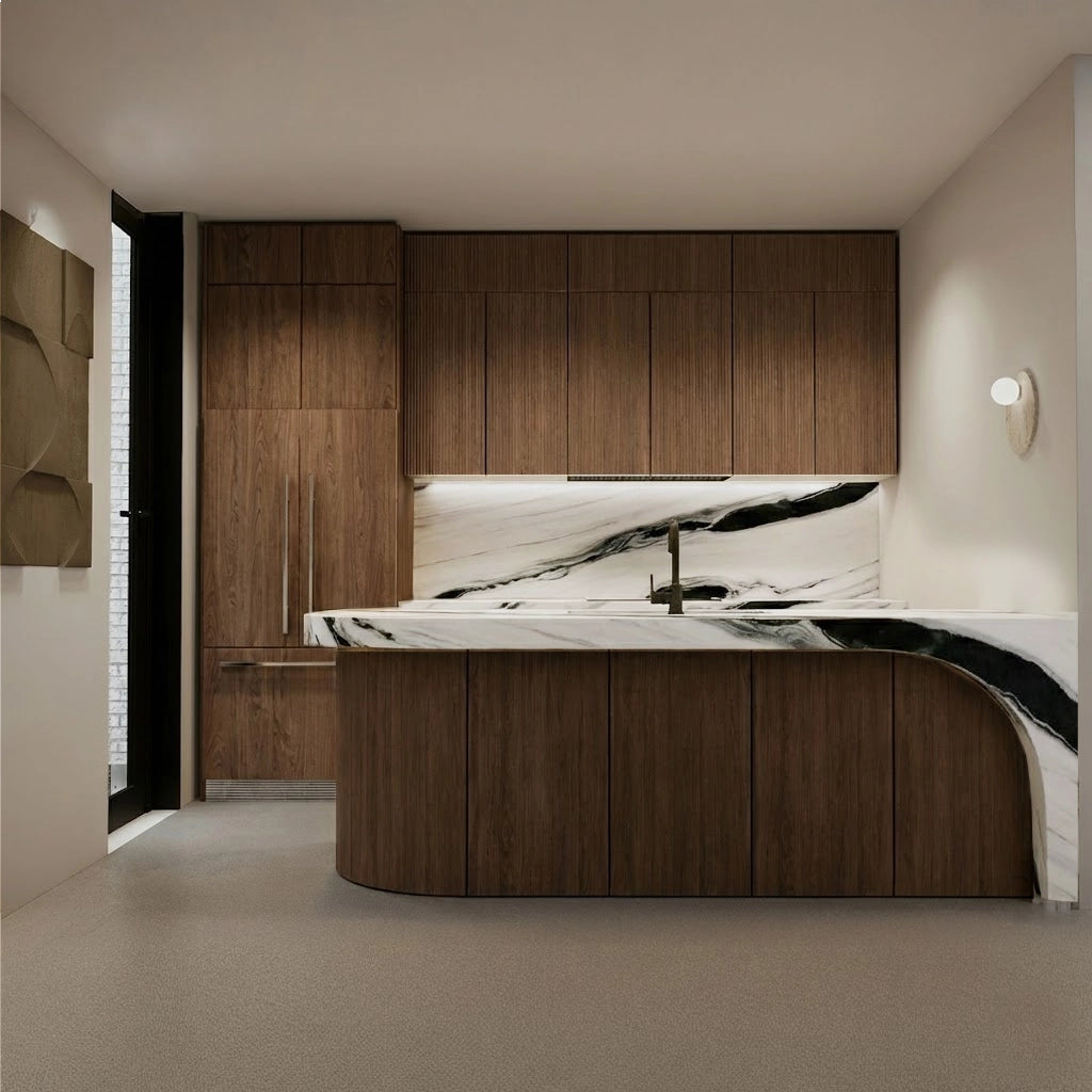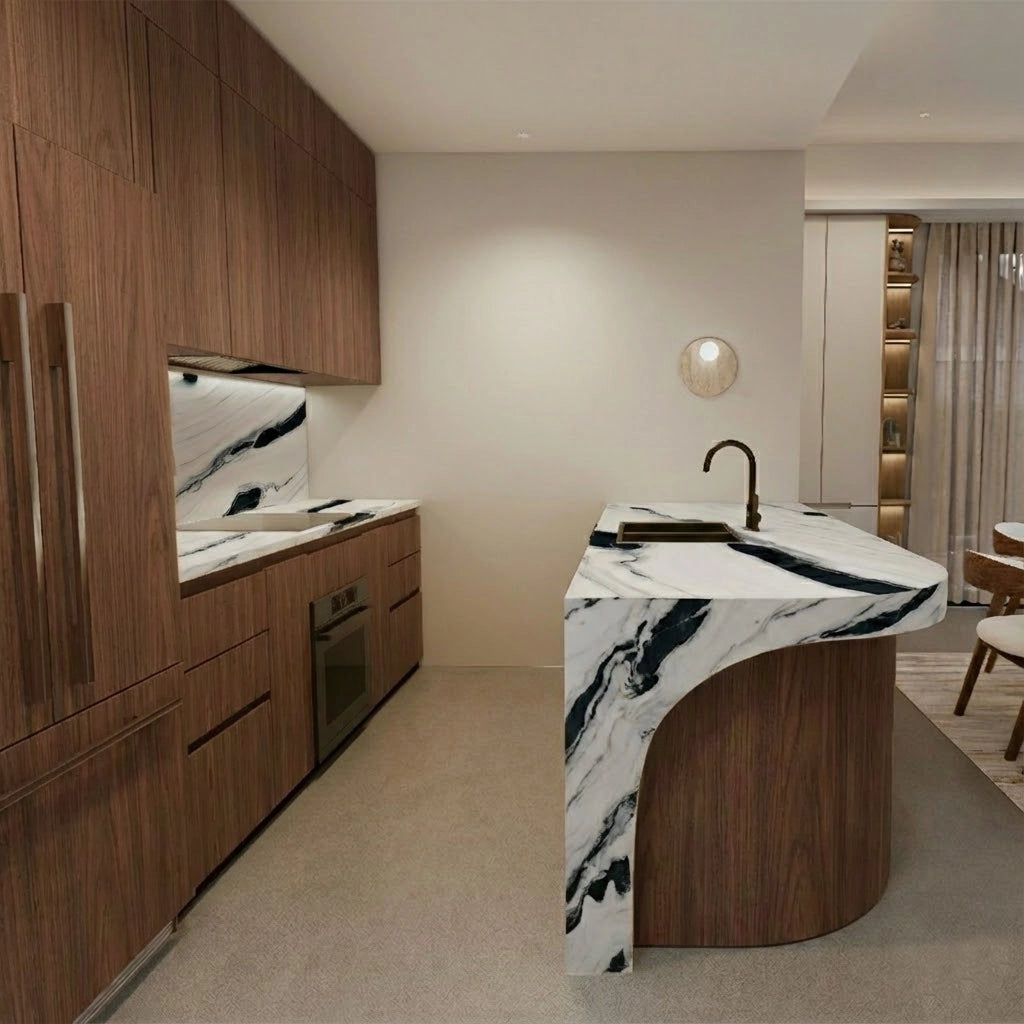 Crafted from premium countertop and splashback stones, these custom kitchen benchtops and matching splashbacks feature a refined, smooth surface with subtle natural veining that elevates any modern culinary space. Their clean, minimalist design provides versatile performance—perfect for meal preparation, kitchen islands, breakfast bars, or as a striking focal point in contemporary interiors.