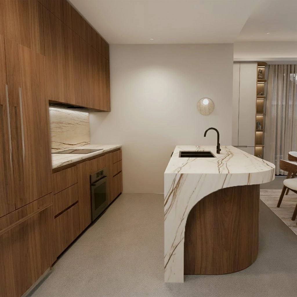 Crafted from premium countertop and splashback stones, these custom kitchen benchtops and matching splashbacks feature a refined, smooth surface with subtle natural veining that elevates any modern culinary space. Their clean, minimalist design provides versatile performance—perfect for meal preparation, kitchen islands, breakfast bars, or as a striking focal point in contemporary interiors.