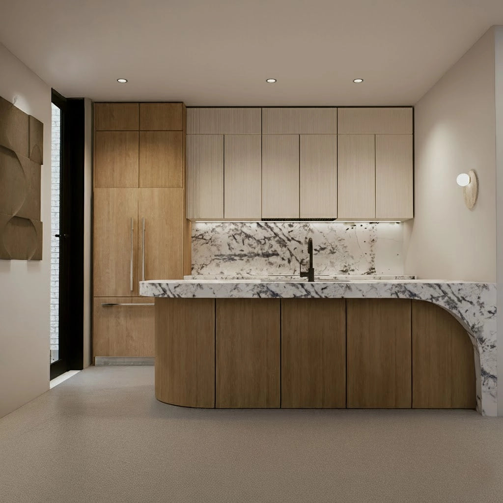 Crafted from premium countertop and splashback stones, these custom kitchen benchtops and matching splashbacks feature a refined, smooth surface with subtle natural veining that elevates any modern culinary space. Their clean, minimalist design provides versatile performance—perfect for meal preparation, kitchen islands, breakfast bars, or as a striking focal point in contemporary interiors.