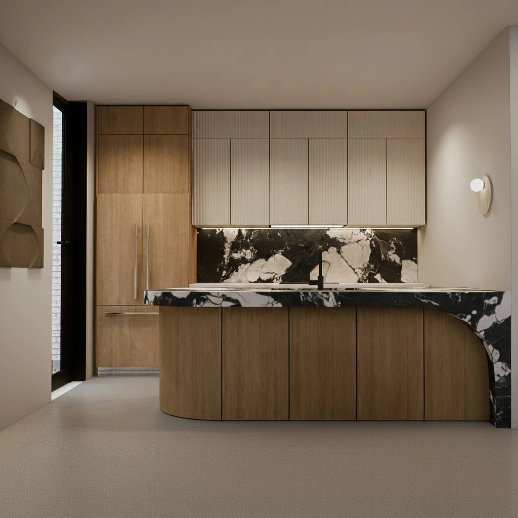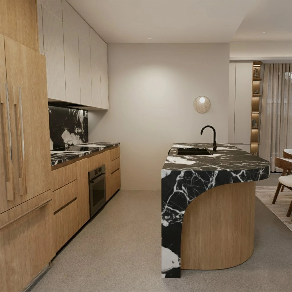 Crafted from premium countertop and splashback stones, these custom kitchen benchtops and matching splashbacks feature a refined, smooth surface with subtle natural veining that elevates any modern culinary space. Their clean, minimalist design provides versatile performance—perfect for meal preparation, kitchen islands, breakfast bars, or as a striking focal point in contemporary interiors.